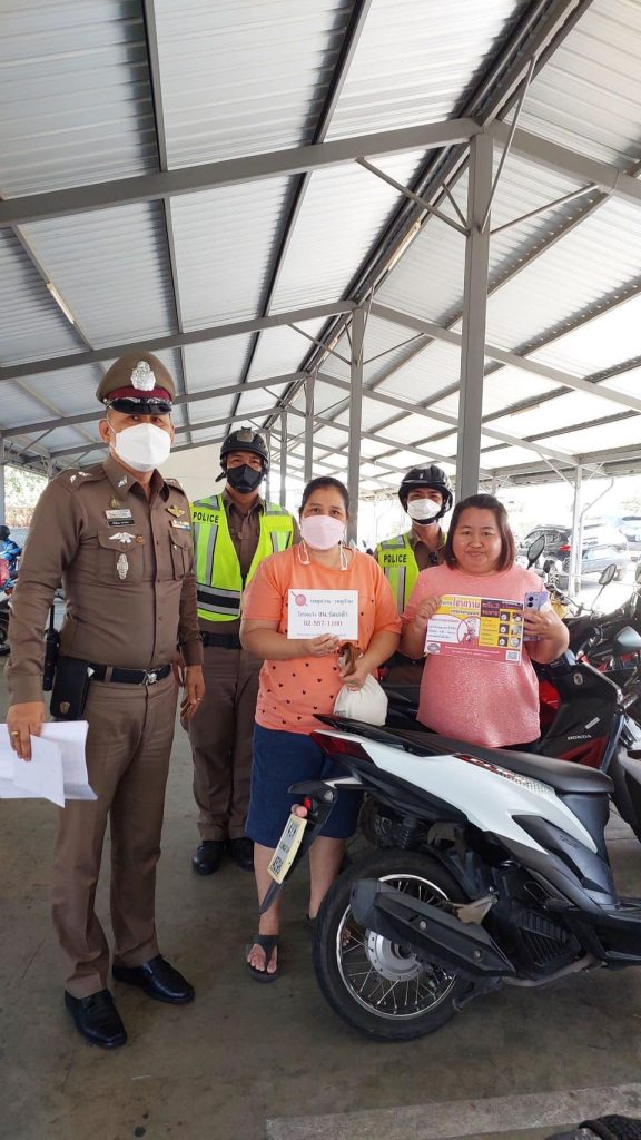 เจ้าหน้าที่ตำรวจฝ่ายป้องกันปราบปราม สถานีตำรวจนครบาลร่มเกล้า ติดสติ๊กเกอร์ประชาสัมพันธ์มาตรการป้องกันรถจักรยนต์หาย ตามหอพัก อพาร์ทเม้นท์ จุดเสี่ยง จุดล่อแหลมต่างๆ