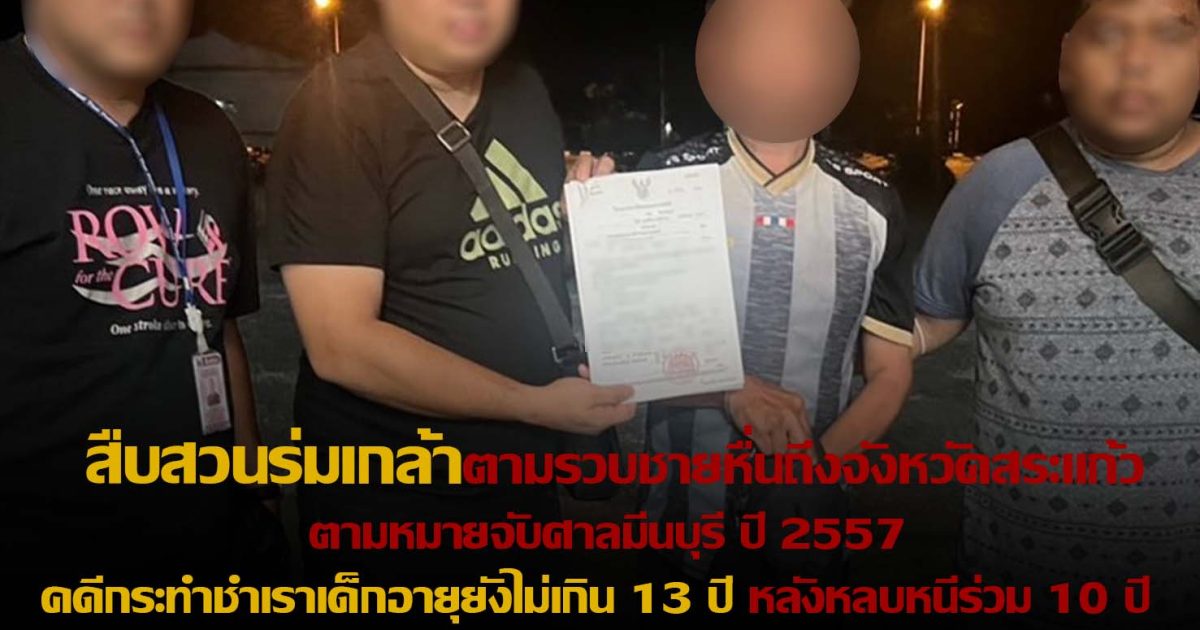 หลบหนีร่วม 10 ปีก็ไม่รอด สืบร่มเกล้าตามรวบถึงจังหวัดสระแก้ว ผู้ต้องหาตามหมายจับศาลมีนบุรี ปี 2557 คดี “กระทำชำเราเด็กอายุยังไม่เกิน 13 ปี ซึ่งมิใช่ภรรยาหรือสามีของตน โดยเด็กนั้นจะยินยอมหรือไม่ก็ตาม” เจ้าตัวรับสารภาพเป็นบุคคลตามหมายจับจริง จึงควบคุมตัวนำส่งพนักงานสอบสวนดำเนินคดีต่อไป