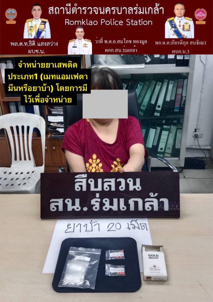 เมื่อ วันที่ 19 ม.ค.67 ฝ่ายสืบสวน สน .ร่มเกล้า ภายใต้อำนวยการของ เจ้าหน้าที่ตำรวจ สน.ร่มเกล้า จับกุม หญิงผู้ต้องหา อายุ 59 ข้อหาจำหน่ายยาเสพติดประเภท1 (เมทแอมเฟตามีนหรือยาบ้า) โดยการมีไว้เพื่อจำหน่าย จำนวน 10 เม็ดบรรจุในถุงพลาสติกใสชนิดกดปิด-ดึงเปิด ซุกซ่อนในกระเป๋าเสื้อข้างซ้ายตัวผู้ต้องหาสวมใส่อยู่ และบรรจุในถุงพลาสติกใสชนิดกดปิด-ดึงเปิด ซุกซ่อนในซองบุหรี่ยี่ห้อ Golt mount วางอยู่ที่เตียงนอนของผู้ต้องหาอีก จำนวน 10 เม็ดรวมยาบ้าทั้งหมดจำนวน 20 เม็ด ผู้ต้องหายอมรับว่ายาบ้าดังกล่าวเป็นของตนมีไว้เพื่อจำหน่ายให้ลูกค้าเม็ดละ 30 บาทโดยรับมาเม็ดละ 15 บาท จึงนำส่งพนักงานสอบสวนดำเนินคดีและขยายผลต่อไป