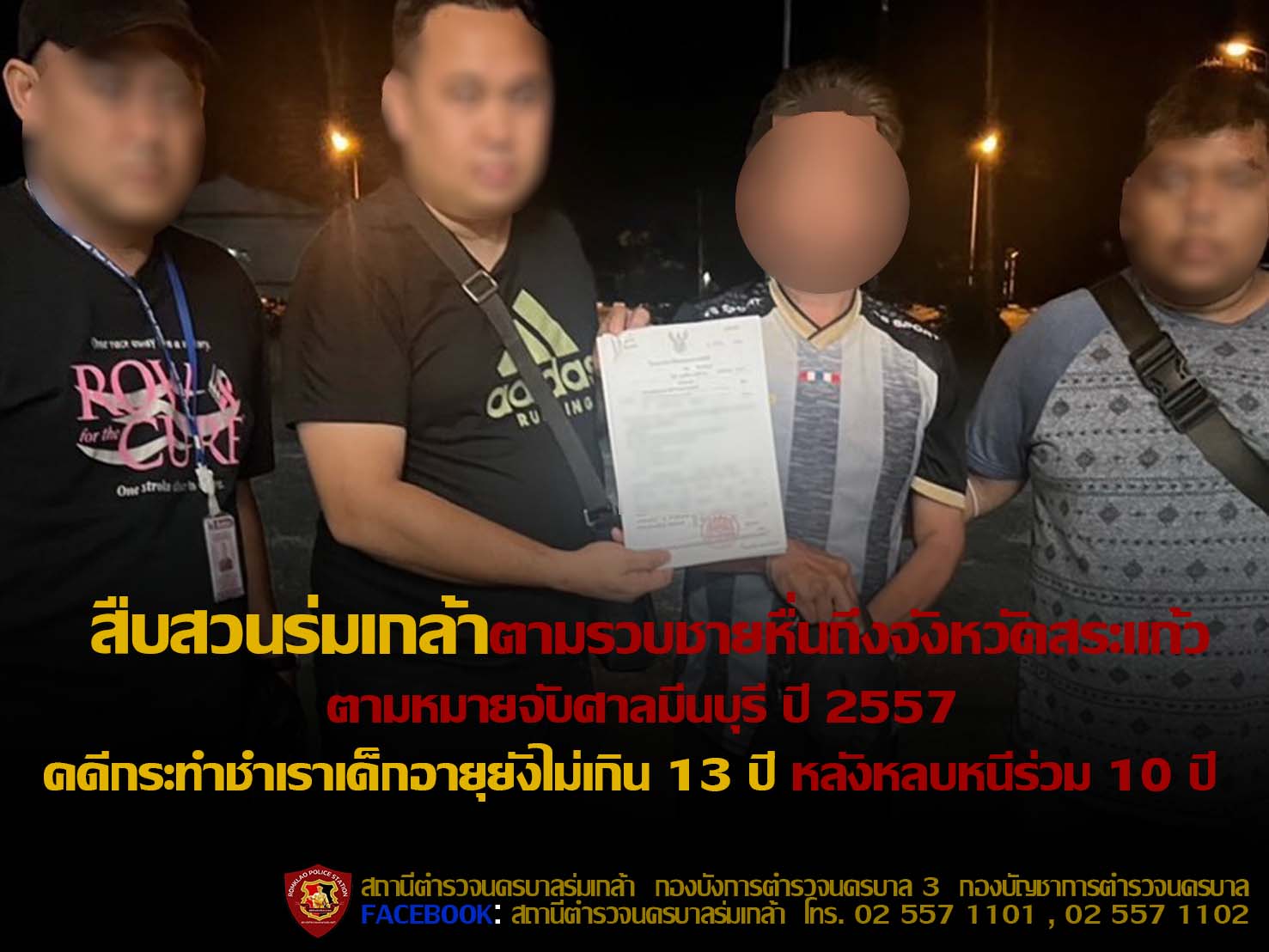 หลบหนีร่วม 10 ปีก็ไม่รอด สืบร่มเกล้าตามรวบถึงจังหวัดสระแก้ว ผู้ต้องหาตามหมายจับศาลมีนบุรี ปี 2557 คด