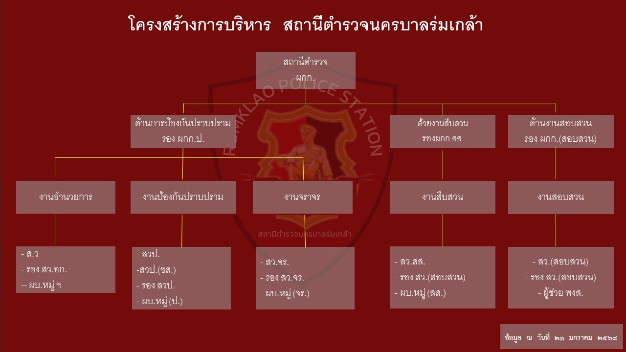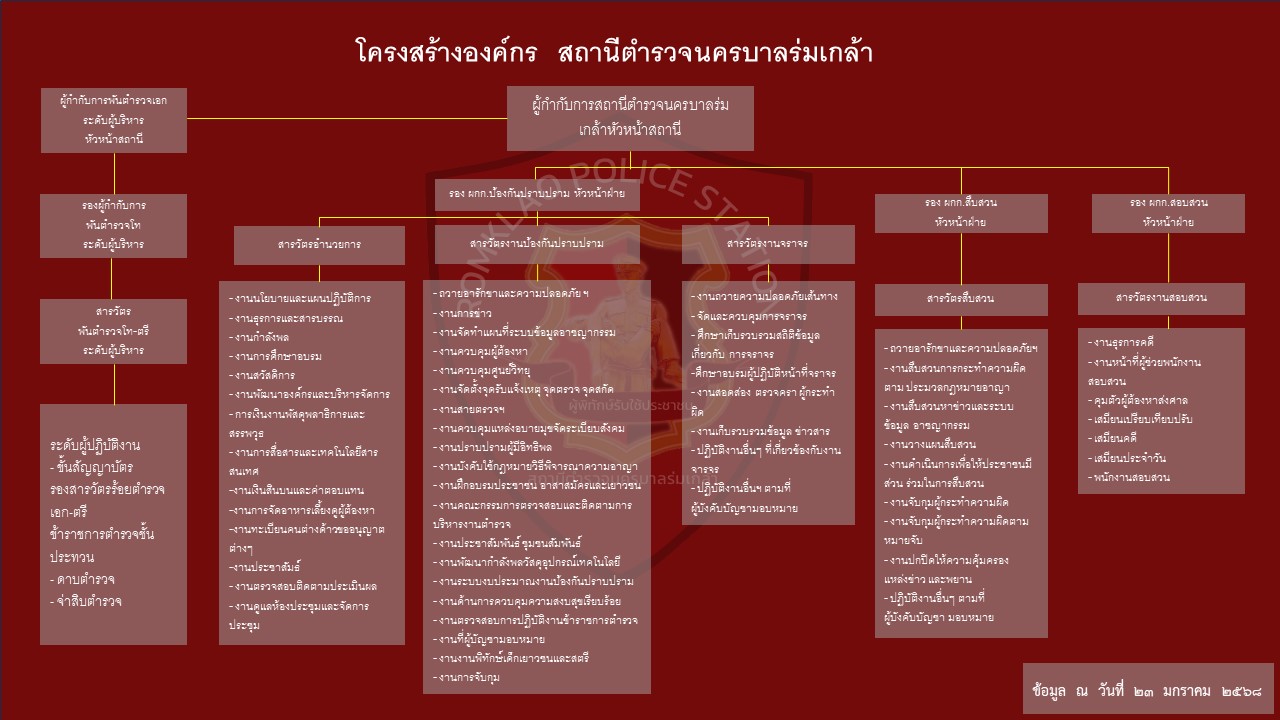 คลิ๊ก การกำหนดอำนาจหน้าที่ของตำเเหน่งในสถานีตำรวจ โครงสร้างสถานี ลักษณะงานในสถานีตำรวจ เเละหัวหน้างานในสถานีตำรวจของสถานีตำรวจนครบาลร่มเกล้า